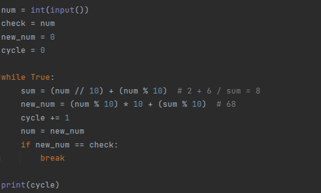1. new_num 에서 (sum % 10) 이 아닌 ( num % 10 )으로 해놔서 계속 무한 싸이클을 돌게 되었다.