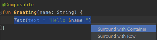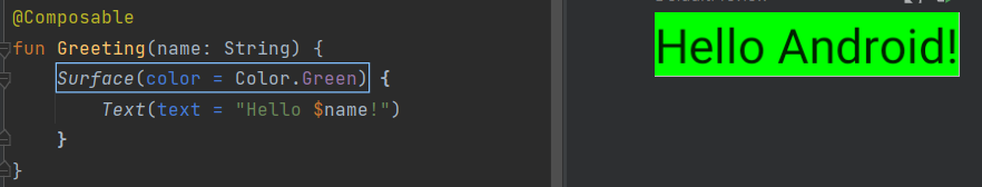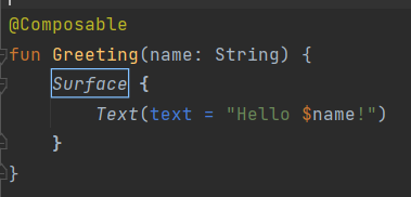 - `Greeting()` 함수 : 위에 `@Composable` 주석이 있으므로 구성 가능한 함수이다.