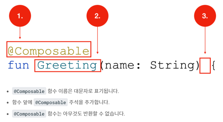 - 주석은 Jetpack Compose에서 이 함수가 UI를 생성하는 데 사용된다고 Kotlin 컴파일러에게 알리는 역할을 한다.